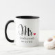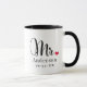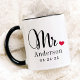 This handsome Mr mug features bold brush calligraphy with a red heart accent, a custom last name in elegant serif, and a wedding date, all on a crisp white background with a sleek black handle and interior. The expressive script paired with the black contrast creates a modern, romantic look. The last name and date are fully editable for a personalized keepsake. A wonderful gift for the groom, newlywed husband, or anniversary. Pair with the matching Mrs design for a his and hers set.