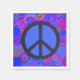 Package of 50 white paper cocktail napkins with an image of a black peace sign on a whimsical background of fuchsia and blue swirls and curls with a royal blue border. See matching cloth napkin, kitchen towel, cloth placemat, paper placemat and coasters. See the entire Psychedelic 60s Napkin collection in the FOOD/BEV | Linens section.