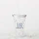 Clear plastic reusable straw cup tumbler, personalised for an upcoming wedding or anniversary gift with "Mr" in large letters with custom last name in a simple modern and masculine font and wedding date on the back. It's a perfect bridal shower keepsake or part of a coordinating set of bridal party cup gifts.