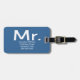 Mr. Luggage Tags are printed with Mr. across the front in white letters, with any 4 lines of personalisation. Include your name, address, phone number ... you choose the details! Personalisation will be printed in white. Features white stripes on the back. Background colour can be changed. Travel with confidence, knowing any misplaced belongings will return safely - perfect for suitcases, garment bags and more! Also comes in a version for the Mrs.