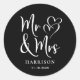 A chic black sticker for your wedding correspondence and party favours featuring "Mr & Mrs" in a large white script and a white illustration of two hearts joined together. Add your name and wedding date.
