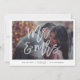 This save the date card features semi-transparent "Mr. & Mrs." text overlaying a photo, with your names and wedding date below. You will likely need to click "click to customise further" to adjust the spacing of the text boxes with your names. If you prefer the location to be on there, simply replace "save the date" with the location instead!