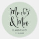 A chic sage green sticker for your wedding correspondence and party favours featuring "Mr & Mrs" in an elegant script and an illustration of two hearts joined together. Add your name and wedding date.