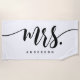Mrs Black And White Newlywed Bride Personalised Beach Towel. Modern script personalised name beach towel. Perfect honeymoon towel for the bride. Personalise this custom design with your own name or text.