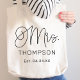 Modern and casual chic black calligraphy script "Mrs." women's wedding tote bag features custom text that can be personalised with the bride's new married last name and wedding date / date established. Perfect accessory for the honeymoon and beyond!