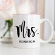 Simple and modern coffee mug features Mrs in script with last name custom text. Perfect gift for a newly married couple! Visit our store for the matching Mr Monogram Mug.