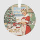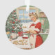 In a cosy, snow-covered kitchen, Mrs. Claus is captured in the midst of holiday baking. Dressed in a festive red dress with fur-trimmed sleeves, and a matching apron, she smiles warmly as she prepares a fresh batch of cookies. The scene is filled with Christmas cheer, complete with a beautifully decorated tree adorned with candy canes and red ornaments, while snow gently falls outside the window, adding to the magical atmosphere of the season.