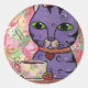 A plump purple tabby cat enjoying a spot of tea and a strawberry.