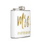 Mrs. Last Name White Flask with Gold Foil Typography. The Mrs. Last Name flask make a perfect bridal shower or honeymoon gift for the bride and matches the Mr. Silver flask for the husband.
