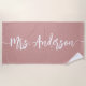 Celebrate your new bride status with this custom dusty rose blush pink beach towel featuring your new last name in white hand lettered signature script lettering with beginning and ending swashes. Makes a great wedding, shower or honeymoon gift.