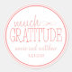 Much Gratitude Flourish Labels / Stickers (Light Pale Pastel Blush Pink / Terra Cotta Red / White)...These fun, elegant, and chic thank you labels / stickers are ideal for wedding favours or a wedding candy bar / buffet full of chocolate, suckers, lollipops, taffy, and sugar. Let your guests know to take a treat home with them to remember your wedding. The design features an array of whimsical fonts with the bride and groom names as well as the wedding date. Ideal for a destination wedding. Perfect for any classy bride or groom. Great idea for a bridal shower or bachelorette party too. Full customisable...just change the names and the dates and your favour stickers are ready to be used. Available in a wide range of colours to match your wedding colours. See WindyCityStationery.com for our complete line of "Much Gratitude Flourish" labels in a wide range of colours as well as matching "Much Gratitude Flourish" postage stamps, thank you cards, return address labels, save the dates and more.