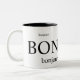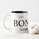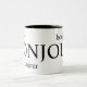 white ceramic coffee mug, black inside, with black lettering all around the mug: BONJOUR, printed several times