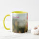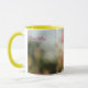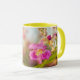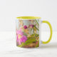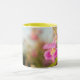 A ringer beverage mug showing a delicate pink and yellow desert willow flower (Chilopsis linearis) that stands out brightly in the golden sunlight against a softly blurred background of greens, pinks, and light blue sky.