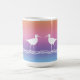 Waterbirds (egrets). White graphic image of two different birds standing in water. The pair is inverted so that the four birds face centre. Background is banded colours of orange, pink, purple, and blue (top to bottom)