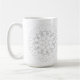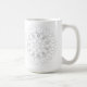 Mandala design with four pattern rings. Central circle of six segments, next circle has six ovals with circles inside. Eleven small sunbursts inside band that is trimmed with tiny circles. Fifteen diamond petals holding a circle create the outer ring. Simple, elegant design that is replicated on both sides of mug.