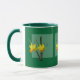 Photographic image of yellow daffodils against diffused squares on dark green background.