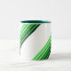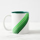 Green lines in varying five shades of blue. Dark to light, bottom to top. Two Sets of stripes are placed diagonally from top to bottom of mug.