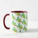 Green leaves with reddish highlights, are multiplied across the mug. Reddish stem supports 3-d looking leaf in shades of green.