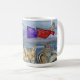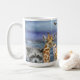 Mug with watercolor collage of Joanna flying over animals. Dark blue painted back ground