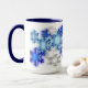3d snowflakes in dark and light blues, white and grey, adorn this mug.