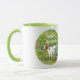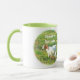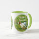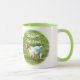A Ringer Mug with colour around the lip and handle in green. Photo of a cute baby goat and the text "Stubborn, But Cute!" Great gift idea!