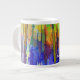 Mug with bright abstract design in mixed colours, with the words "Time to Wake Up! The abstract was originally a photograph of trees in the woods.
