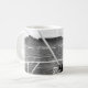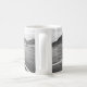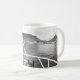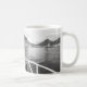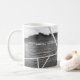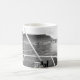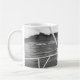 Coffee mug with a black and white image of a boat entering the harbour of Cape Town in Table bay with Table mountain in the background.