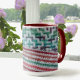 Colourful multi colour crocheted patterns in bright blue, green, maroon, white, and pink shades wrap around theses mugs. The original crochet needlework was handcrafted with love. These beautiful mugs have the feel of cosy warm comfort all wrapped in love and make wonderful gifts.