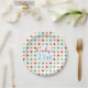 Multi-coloured polka dot pattern on personalised paper party plates. Personalise for Birthdays or any occasion.
