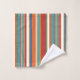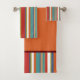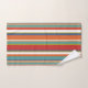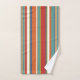 Trendy towel set featuring a multicolored stripe pattern in red, blue, orange and green.
