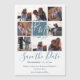 Dusty blue and sage leaf monogram wedding save the date, eight photo, block style frame magnetic announcement with beautiful sage watercolor leaves that circle around the modern script initials in centre block.