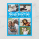 Family photo collage postcard with "happy new year" text and year numbers behind. Bright blue with white text for the greeting and dark blue for the signature. There is plenty of space to include names. Upload five favourite photos to the templates provided and share stories from the past year in pictures. Reverse is gradient gold colour with a place to type in a mailing address - which will have to be done individually for each address. OR, delete that text and hand write after ordering.