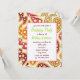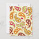 A colourful birthday party invitation featuring a pink, green, burgundy, orange, and gold paisley pattern on front and back. Personalise the burgundy and green text with details of your occasion.