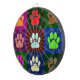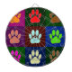 A colourful dog paw print pattern in pink, orange, blue, yellow and other colours.