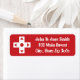 A cherry red return address label is decorated with a white D-pad on the left and sample text on the right for customising to make it your own.
