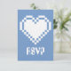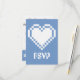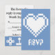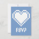 This fun and geeky RSVP card features a periwinkle blue background and a large 8-bit heart in white on the front. A periwinkle border along the bottom edge of the card with a pattern of white video game related icons, including joysticks, D-pads, computer mice, and pixel hearts, decorates the back with some sample text in place above that can be customised to fit your needs.