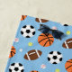 A beach towel with a sports themed pattern from a selection of sports ball equipment like basketball, American football, soccer ball, baseball, tennis ball and a golf ball. Background colour can be changed. Great for boys who love sports! Add name in blue banner space provided.