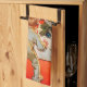 A funny vintage Christmas kitchen towel featuring three curious kids watching mum kissing Santa Claus.