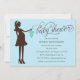 This baby shower invitation features the silhouette of a pregnant woman holding a mint green one piece baby outfit on a hanger. The words "baby shower" are written in brown script typography. Background is baby blue. Graphics ©revidevi.
