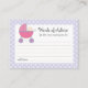 A fun activity for you to include at the baby shower - place these cards on the tables and invite guests to give the new Mummy-to-be advice that she's sure to appreciate and will make lovely little keepsakes for her to keep. Pastel pink and white polkadot design is decorated with an adorable baby in her pink and purple pram - perfect to coordinate with just about any baby girl shower theme.