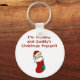 A baby wearing a red stocking cap inside a holiday stocking and red kid style text that reads "I'm Mummy and Daddy's Christmas Present!" on cute baby's first Christmas tote bags, Tshirts, and bodysuits!