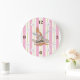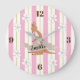 This adorable wall clock features a momma kangaroo and her baby, set on a background of pastel pink and yellow stripes. There is a thin green accent stripe and two white flowers complete the design. The banner across Mama Kangaroo can be personalised with your child's name or you can remove the banner and name. This clock is part of the "Mummy & Me Kangaroo Collection".