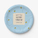 Cute baby shower paper plate for the Mummy to Bee, or Sweet as Can Bee for a baby boy, featuring lopping bumble bees on a cornflower blue background and personalised handwritten text for a name and date of the event.