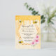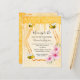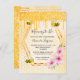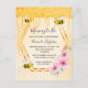 Elegant, fun baby shower invitation celebrating a baby girl or gender neutral. Yellow, white background with a honeycomb pattern. With a faux gold geometric frame, and faux gold glitter drips. Paint drip look. Decorated with pink tropical florals flowers, hibiscus and happy bumble bees. With the text: Mummy to Bee and the name om the mother to be on front written with a modern hand lettered style script. Black letters.
