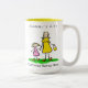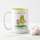 Mother and daughter hold hands. The mother's shirt read "mummy" and the daughter's shirt reads "me". The family has blonde hair. This image also comes in no colour or colour with brunette mother and daughter. Customise this mug with your own personal names to make a custom Mother's Day gift!