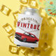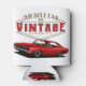 This is a rendering of a red American classic muscle car with vintage style graphics in the background for a retro look.