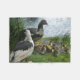 A photograph of two Muscovy ducks with their ducklings in the rain.