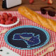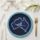 A dog sled with a teal sled bag and the Southern Cross superimposed on a blue map of Australia. All on a starry background. You may customise by adding a bit of text on the sled bag.
