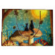 Cute image of two cats sitting atop a giant mushroom in a forest filled with mushrooms watching the autumn leaves fall against the sun and blue sky to create a wonderful storyland picture.