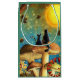 Cute image of two cats sitting atop a giant mushroom in a forest filled with mushrooms watching the autumn leaves fall against the sun and blue sky to create a wonderful storyland picture.
